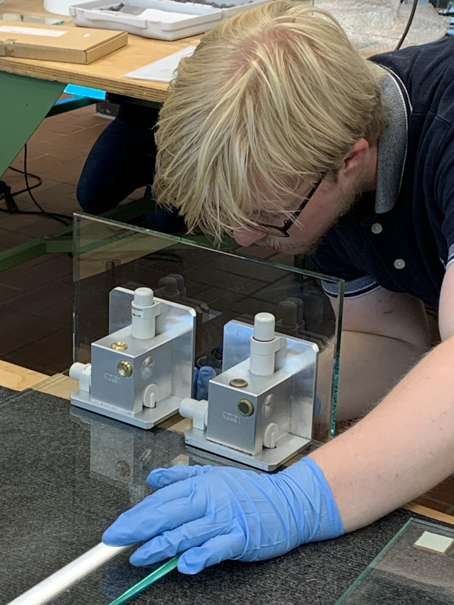 Einen Tag später erhielten die Azubis des 1. Ausbildungsjahres eine umfangreiche theoretische und praktische Schulung zum Schneiden und Öffnen von Glas mit vielen Tipps und Tricks für die berufliche Praxis.